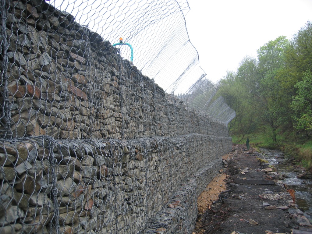 歐洲也叫格賓網。石籠網箱在施工現場經石頭填充,構成具有柔性、透水性及整體性的結構, 如擋墻、河道襯砌、護岸、護坡、固腳、護腳等支擋的防不沖蝕工程。 石籠網箱由間隔1米的隔板(雙絞合六邊形金屬網片)分成若干單元格,為了加強石籠網箱結構的強度, 所有的面網板邊端均采用直徑粗的鋼絲。控制和引導河流及洪水泄洪壩、導流壩巖崩防護、防止水土流失、大橋保護、固土結構、海濱防御工程、港口工程和擋土墻道路防護.。